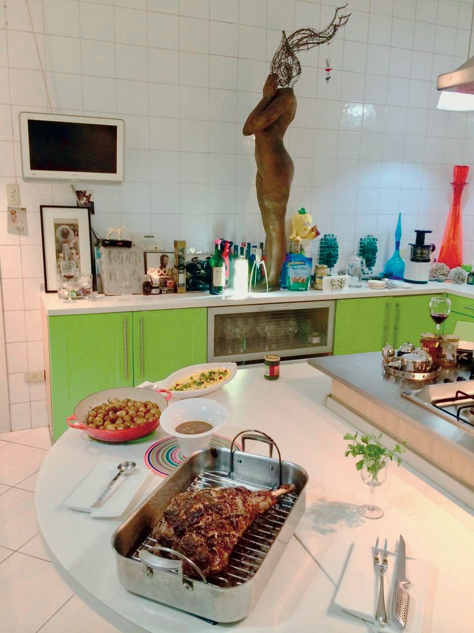 Sculptor Impy Pilapil enjoys having friends over to savor a hearty meal, which she has lovingly prepared. Years before entertaining in the kitchen became the norm, she had designed hers as a vital part of the living space. It is customized as a food preparation area, casual dining room, and a display of some artworks.