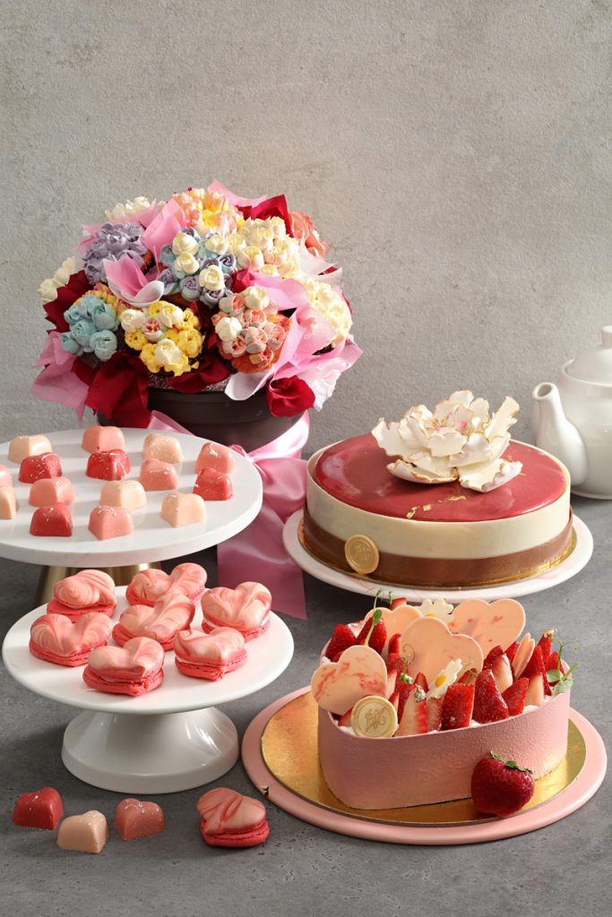 Delight loved ones with confections, including the Frosting Flowers Cupcake Bouquet, the Amour Doré Macaron collection, and cakes such as Caramel Kisses and Strawberry Caress, available for purchase at onlineshopping.diamondhotel.com until February 15.