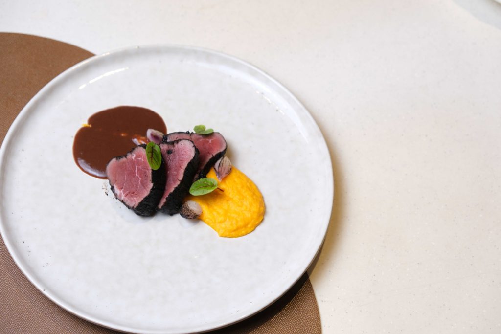 Priced at P6,000 per person, the bespoke five-course dinner opens with an elegant trio of amuse-bouches, followed by charred octopus with romesco sauce, cherry tomatoes, and puffed quinoa before a refreshing rosé wine berry sorbet prepares the palate for the main course.